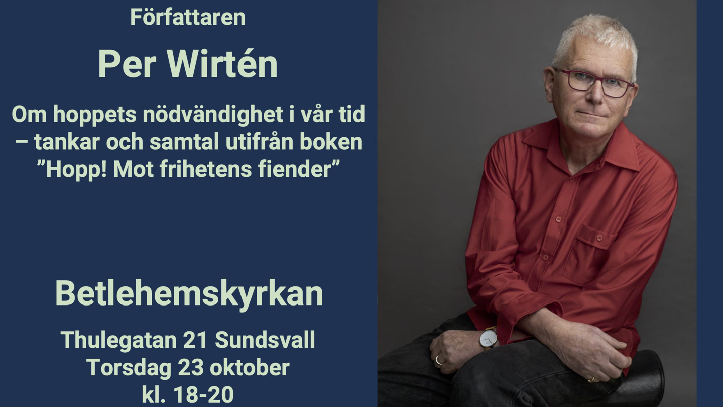 I mörka tider behöver vi välja hoppet. Välkommen till en kväll med författaren och debattören Per Wirtén som förra året kom ut med boken ”Hopp! Mot frihetens fiender”. Han har gjort sig känd som skarpsynt och orädd samtidskritiker. I sin bok spårar han hoppets uttryck i olika tider och söker efter ett trotsigt hopp liknande det som Martin Luther King gav uttryck för. Kulturcaféet är en uppföljning av en samtalscirkel under våren med temat hopp. Tid: Torsdag 23 oktober kl 18–20. Fri entré, servering. Samarrangemang med Bilda. (Foto: Thron Ullberg)
